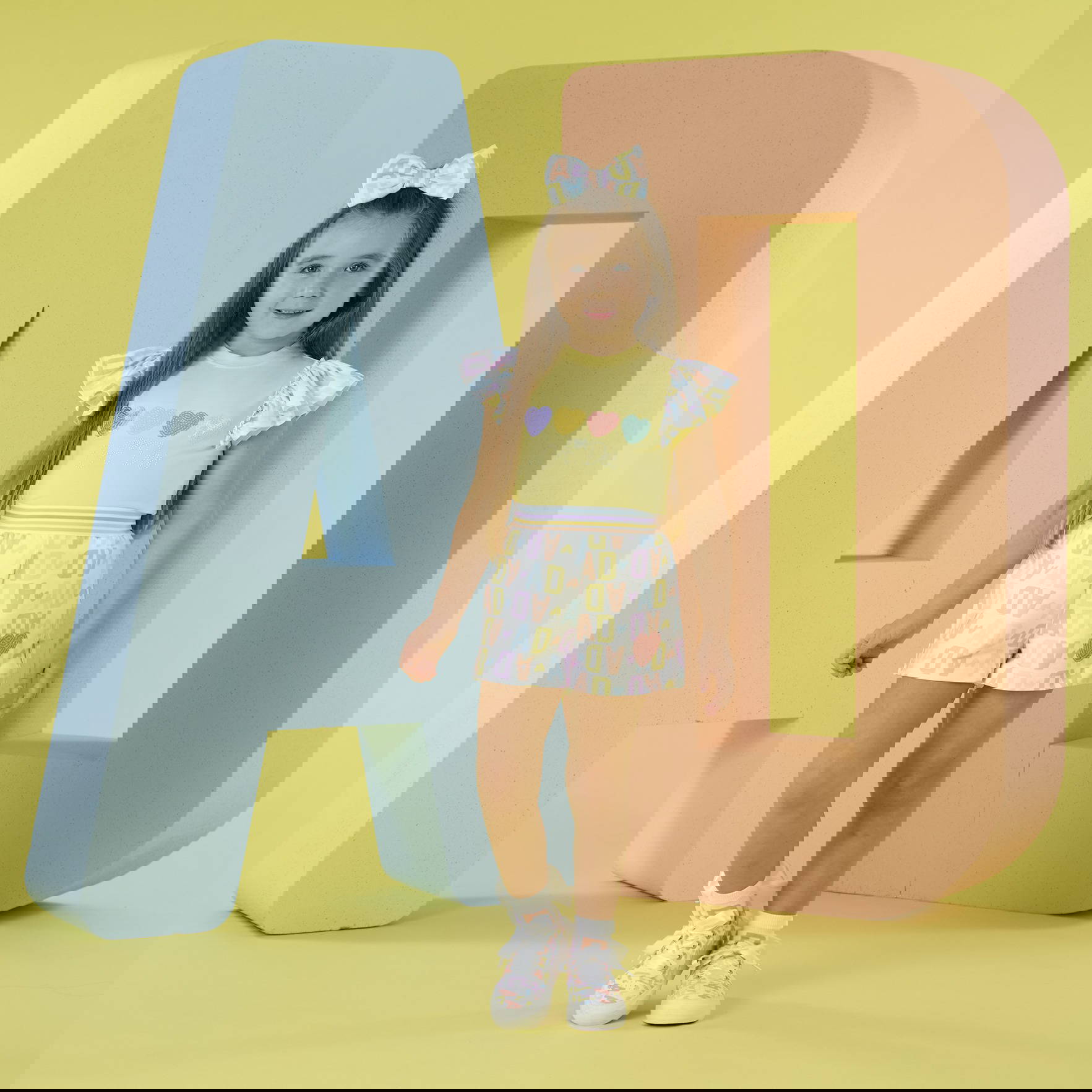 The Sienna short set features a yellow soft jersey top with a heart sequined artwork and frilly initial print sleeves. Paired with initial print jersey shorts finished with an elasticated striped waistband.